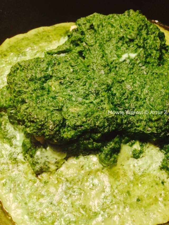 Filety z mintaja lub jakiejś innej ryby układamy w naczyniu żaroodpornym na odrobinie oleju lub oliwy i przekładamy masą ze szpinaku i jajek, aż skończą nam się składniki.